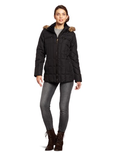 97L3 | This down jacket from larry levine is warm and stylish, the hip length jacket features a cozy valboa lined stand collar and removable faux-fur trimmed hood that can be kept on for cooler days or zipped off for a sleeker look, the multi quilt detail gives off a slimming waist appearance paired with the back side tab details for a flattering silhuette, the zipper front features piping detail in our machine washable faux leather, zip close pockets keep your belongings safe and secure, water resistant and machine washable ... .